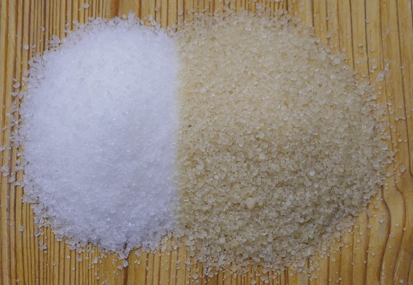 Nella foto del dettaglio, a sinistra lo zucchero bianco di barbabietola bio, mentre a destra lo zucchero di canna bio Golden